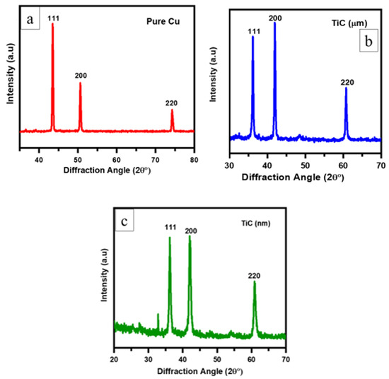 Figure 3a depicts the XRD spectrum of the as-received Cu powder, which shows the characteristic peaks corresponding to Cu (111), Cu (200), and Cu (220) at diffraction angles of 2θ = 44.5°, 52.5°, and 75.2°, respectively [5]. The XRD patterns of TiCµ and TiCn powders are presented in Figure 3b,c. For both powders, distinct peaks at 2θ ≈ 35.9°, 41.9°, and 60.7° were observed, representing the (111), (200), and (220) planes of TiC [9]. These results verify the crystalline phases of the reinforcements.