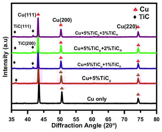 Figure 4 presents the XRD profiles of the Cu–TiCµ–TiCn composites fabricated with different reinforcement ratios. The diffraction peaks confirm the presence of both Cu and TiC phases, with no evidence of additional phase formation. The addition of TiC to the Cu matrix did not result in the formation of new phases, indicating that no chemical reactions occurred during sintering. Moreover, with increasing nano-TiC content, the relative intensity of TiC peaks became more pronounced, consistent with earlier reports [5,6]. Importantly, no oxide-related peaks were detected, suggesting that the nitrogen atmosphere effectively prevented oxidation. The absence of secondary phases and the uniform TiC distribution observed by SEM and XRD suggest that TiC remains chemically stable during sintering and forms a predominantly mechanical interface with the Cu matrix, consistent with reported Cu–TiC interfacial behavior [9,13]. Thus, it can be concluded that the fabricated materials are Cu–TiC composites, with TiC serving solely as a reinforcement phase.
