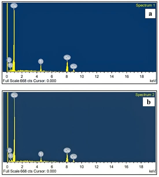 EDS analysis of prepared composites: (a) Cu-5% TiCµ composite, (b) Cu-5% TiCµ-1% TiCn.