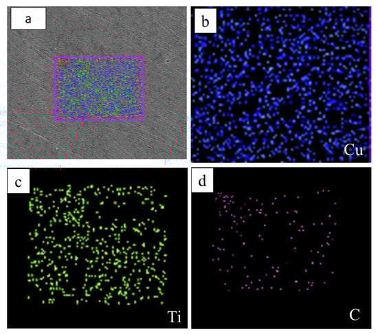 Elemental mapping of the Cu + 5 wt.% TiCµ + 2 wt.% TiCn composite showing the distribution of (a) Mix, (b) Cu, (c) Ti, and (d) C.