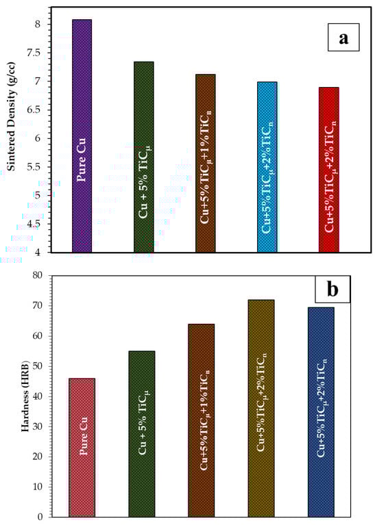Effect of TiC reinforcement on (a) sintered density and (b) Rockwell hardness of Cu–TiCµ–TiCn composites as a function of nano-TiC (TiCn) content. Both measurements were performed at room temperature (~30 °C) under ambient atmospheric conditions.