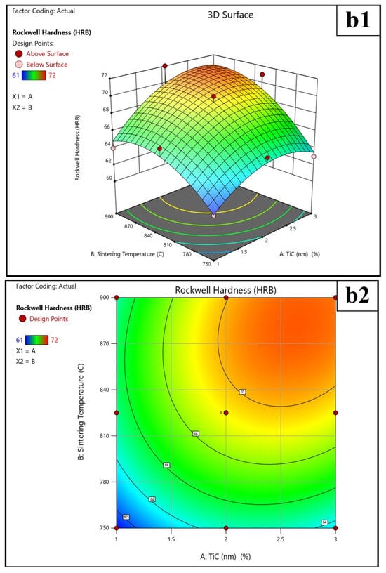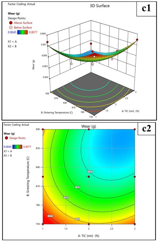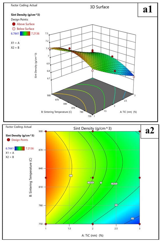 Three-dimensional and 2D Surface plot for the effect of TiCµ, TiCn concentration, and sintering temperature on (a1,a2) Sintered density, (b1,b2) Rockwell Hardness, and (c1,c2) Wear loss response.