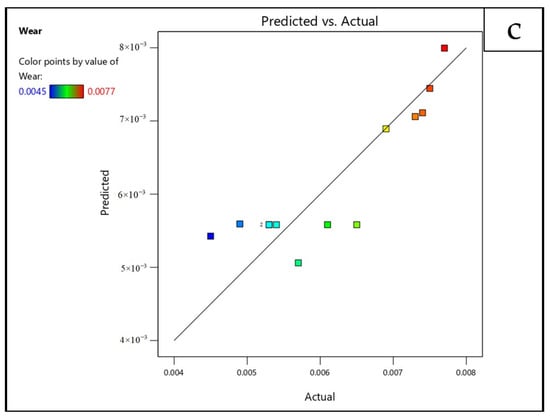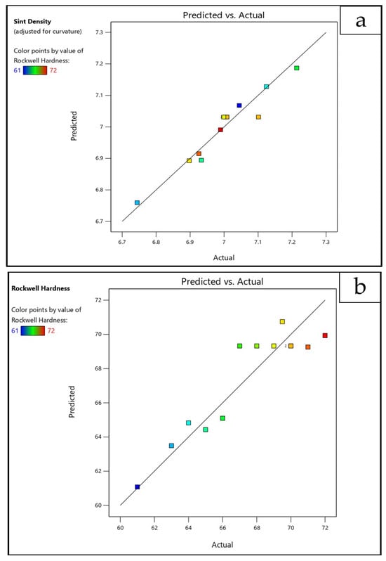 Predicted vs. actual plot for (a) sintered density, (b) hardness, and (c) wear loss.