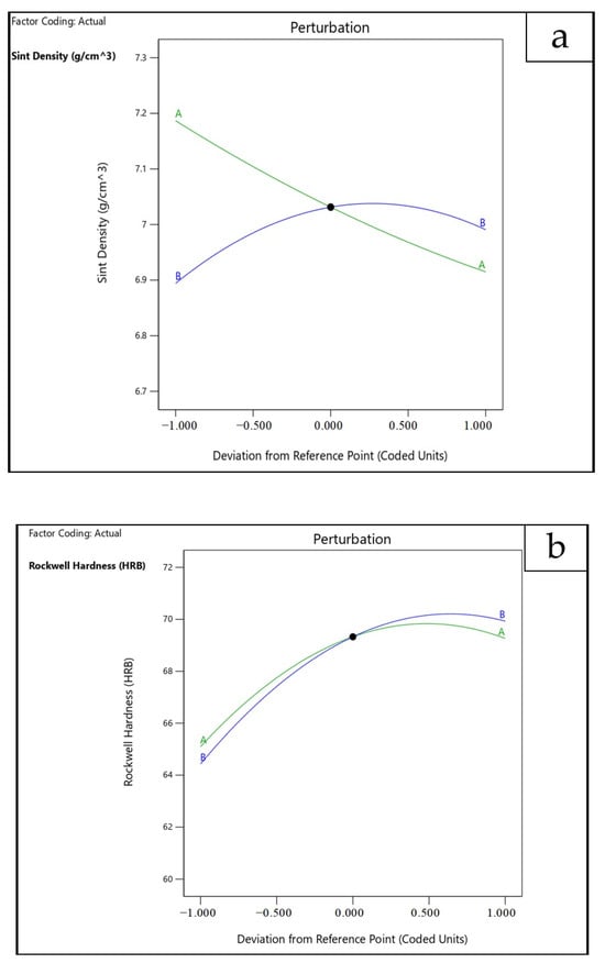 The perturbation plots presented in Figure 12 illustrate the influence of individual process parameters on the selected responses, namely hardness, sintered density (SD), and wear loss (WL), with a central reference point set at 0.00.
