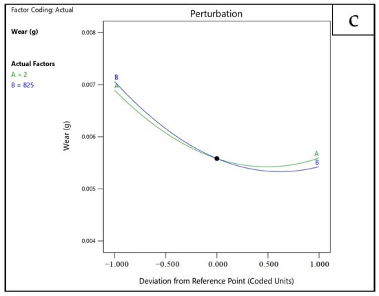 The perturbation plot for wear loss (WL) is shown in Figure 12c. The inclusion of graphene significantly improves wear resistance of the composites up to an optimum level. Beyond 0.2 wt.% graphene, wear resistance decreases, which could result from (a) destabilization of the protective tribolayer at higher graphene contents, and (b) loss of hardness at excessive reinforcement levels (0.3 wt.%). Regarding the sintering temperature, WL shows a decreasing trend up to 900 °C, at which the minimum wear loss is observed. This reduction can be associated with improved densification and mechanical strength achieved at elevated temperatures.