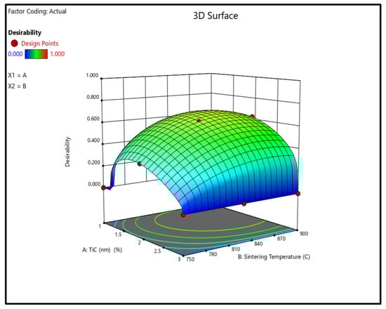 The combined influence of TiCn reinforcement content and sintering temperature on the functional properties of the Cu–TiC composites is illustrated through the response surface plots in Figure 10.