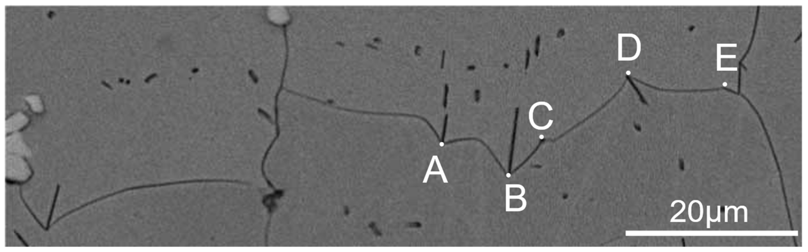 - Tang, Y.T.; Karamched, P.; Liu, J.; Haley, J.C.; Reed, R.C.; Wilkinson, A.J. Grain Boundary Serration in Nickel Alloy Inconel 600: Quantification and Mechanisms. Acta Mater. 2019, 181, 352–366. [Google Scholar] [CrossRef]