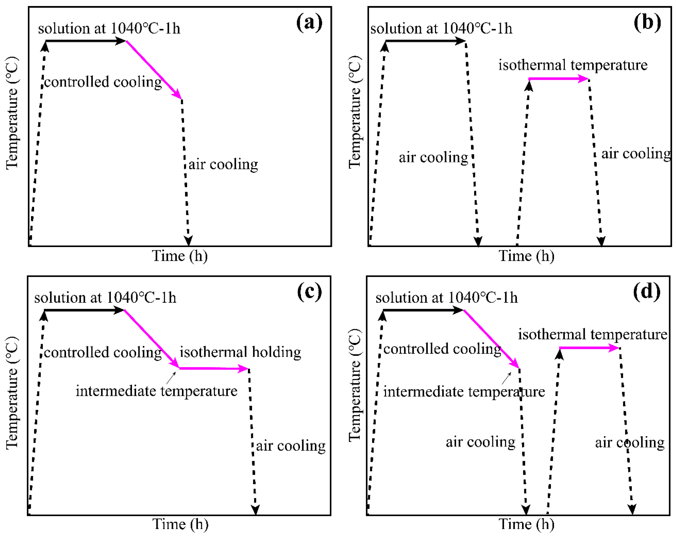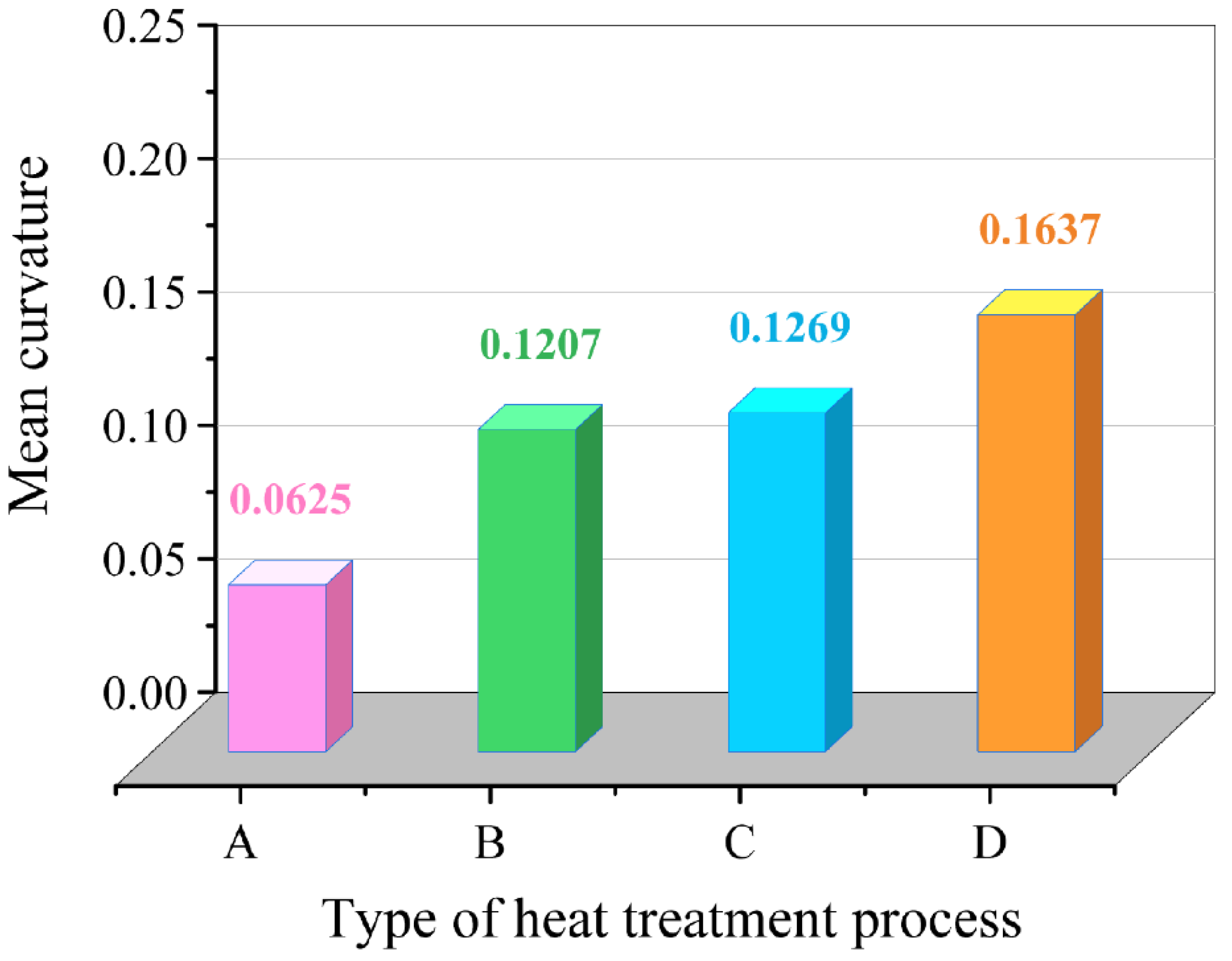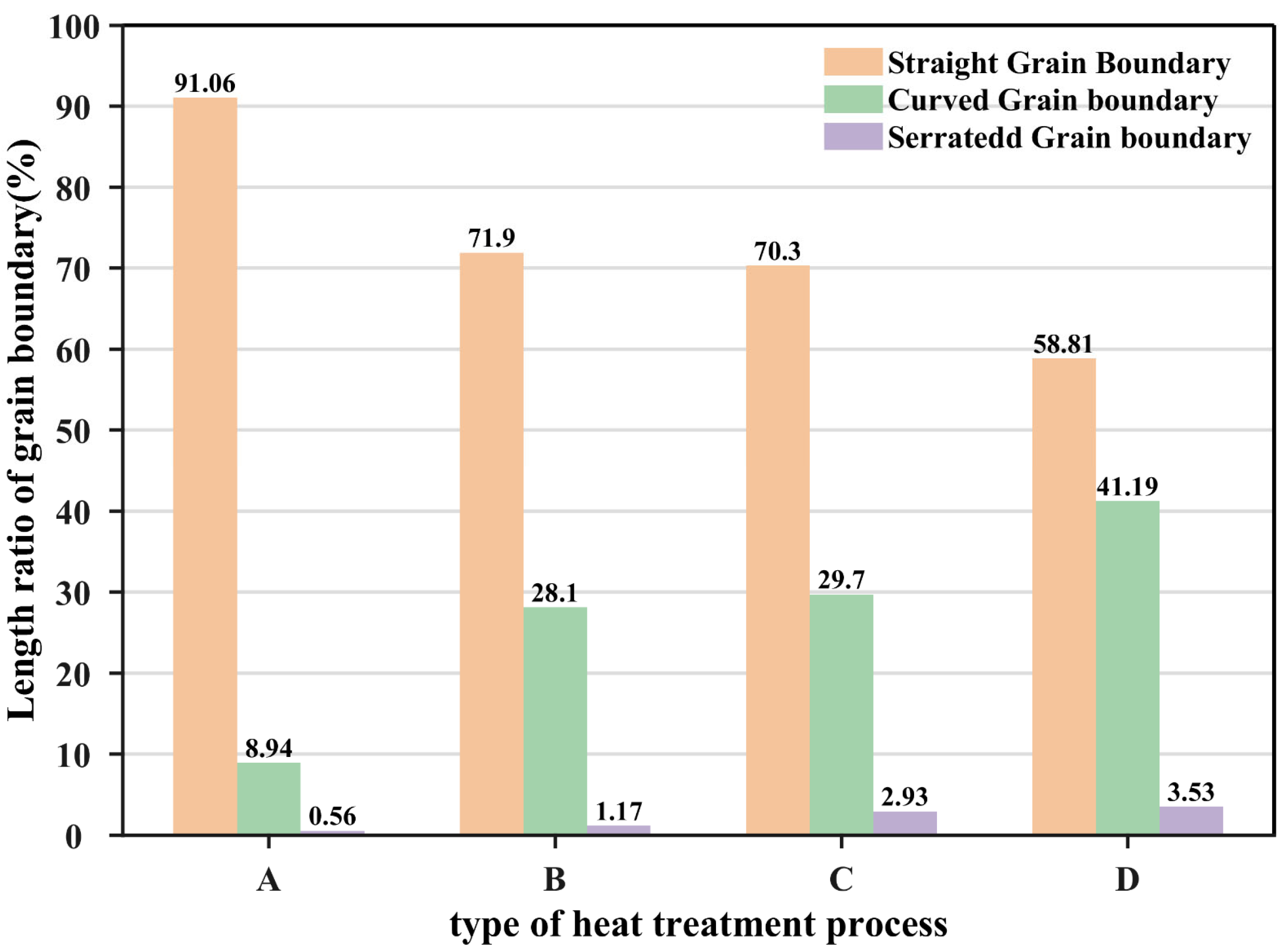 - The four heat treatment processes produced distinctly quantifiable grain boundary morphologies. Controlled cooling (Process A) yielded MC = 0.0625 with 91.06% straight boundaries. Isothermal treatment (Process B) and combined treatment (Process C) achieved MC = 0.1056 and 0.1112, respectively, with Process B producing predominantly wavy boundaries and Process C generating more serrated features. Re-dissolution treatment (Process D) was most effective, achieving MC = 0.1252 with 3.53% serrated regions.