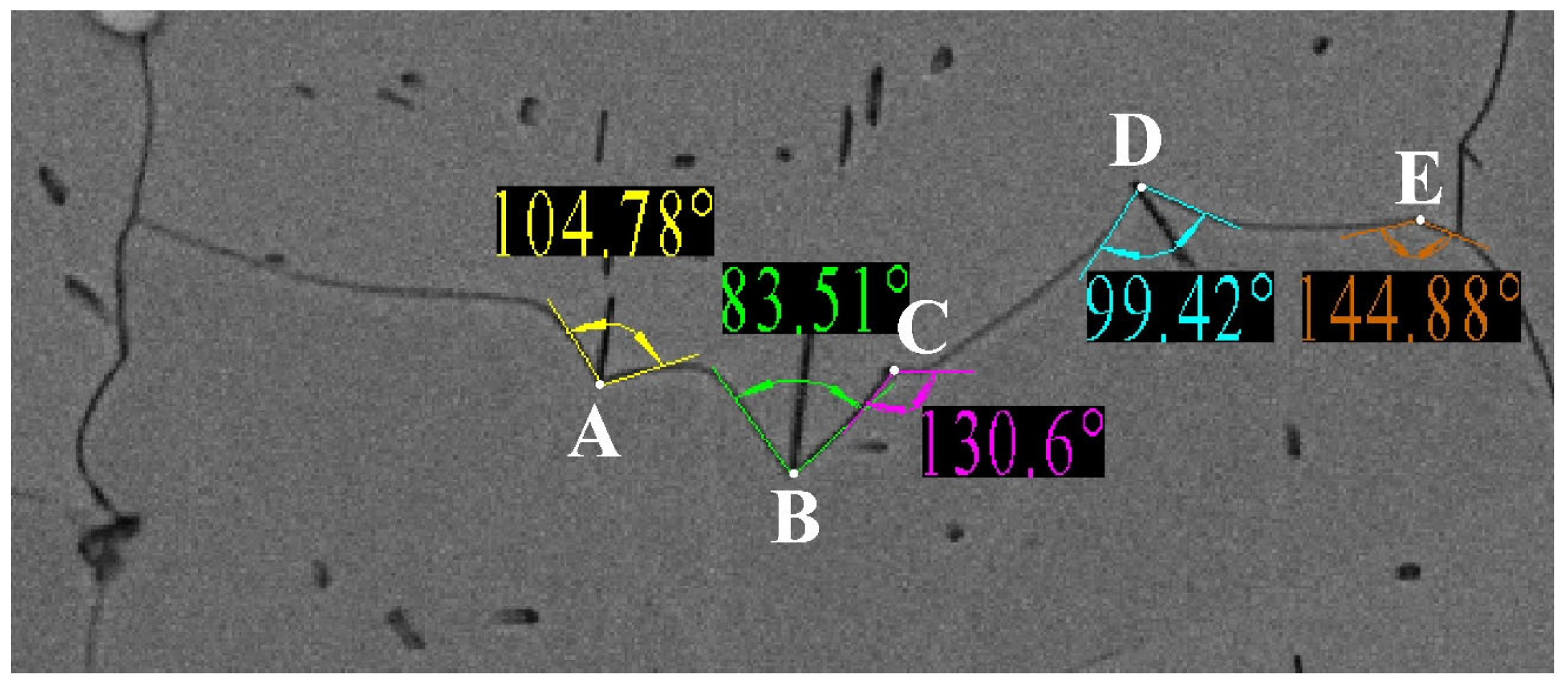 - The proposed framework combining curvature variance filtering with U-chord curvature calculation enables automated and accurate grain boundary characterization. The curvature variance filtering adaptively smooths data while preserving corner features, and the U-chord curvature ensures rotational invariance and noise resistance. Validation demonstrates that calculated angles agree with measured values within approximately 10° deviation, confirming the method’s reliability.
