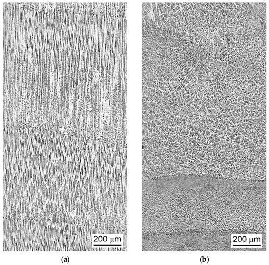 Figure 4 schematically illustrates the structural states of specimens for two technological modes: (a) without forging, and (b) with interlayer forging. In the first case, elongated columnar grains with a pronounced texture are observed, while in the second, a more dispersed structure with equiaxed crystallites and a blurred texture character is formed [8,17]. This process is accompanied by an increase in carbide fraction [8,41]. After forging, the layer height is approximately 1.2 mm, the interdendritic spacing decreases to 10–30 μm, and the grain size ranges from 20 to 60 μm.