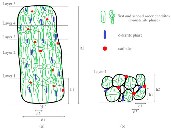 Schematic representation of typical structural elements of 308LSi steel produced by layer-by-layer deposition: (a) without forging, (b) with interlayer forging. Black shows high-angle boundaries (formed crystallites), green shows first- and second-order dendrites (γ-austenitic phase), blue shows δ-ferrite phase, red shows carbides and oxides. Here, “Layer i” denotes the deposited i-th layer of metal; “h1” is the layer height; “h2” is the grain height; “d1” is the dendrite width; “d2” is the interdendritic spacing and “d3” is the grain width.