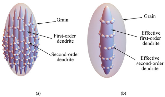 At the mesoscale, individual grains are considered; each characterized by a specific ellipsoidal shape, crystallographic lattice orientation, and an effective internal substructure of first- and second-order dendrites (Figure 6). The structure of first-order dendrites (Figure 6a) is represented by an effective (average) ellipsoid (Figure 6b). Based on the characteristic sizes of first-order dendrites and grain dimensions, the number of dendrites within grain is determined as follows: