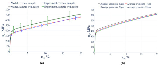 Figure 7a presents the comparison of experimental and computed stress–strain curves for forged and non-forged samples. The maximum deviation does not exceed 3%, confirming the accuracy of identification and adequacy of the model. Series of parametric simulations were conducted for different initial grain sizes; results for forged samples are shown in Figure 7b and are consistent with the Hall–Petch relation (Equation (17)).