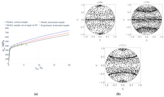 During the verification stage, the experimental and numerical results for horizontal specimens under uniaxial loading were compared (Figure 9a), with the overall mean error not exceeding 2%. Uniaxial tensile tests indicate that horizontal specimens exhibit a yield strength 5–7% higher than vertical specimens. Maximum yield strength is observed for specimens cut at 45°, which is 6–8% higher than horizontal specimens [14,69,70]. This effect is explained by differences in dislocation mean free paths in elongated grains along different loading directions. The multilevel model reproduces this anisotropy accurately: calculated flow stress for horizontal non-forged specimens is 6% higher than vertical; 45° specimens show a 6% increase relative to horizontal (Figure 9a). Figure 9b shows the calculated pole figures for the horizontal specimen, exhibiting the most pronounced texture at the end of deformation, which qualitatively agree well with the experimental data [71,72,73].