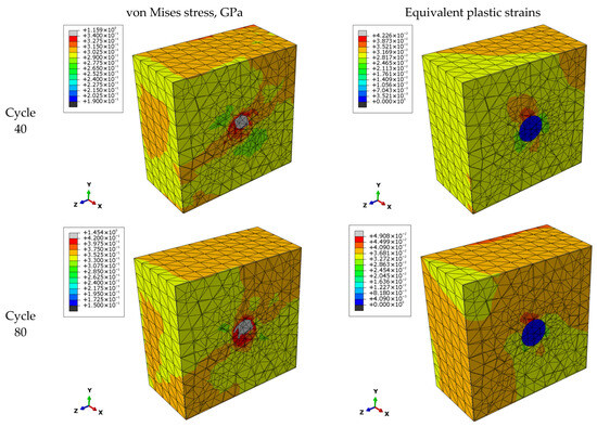 Cyclic loading was applied at the top boundary as a sinusoidal stress, amplitude near matrix yield stress, simulating realistic multicycle conditions [89]. A total of 80 cycles were simulated, sufficient for capturing microcrack nucleation and evolution [74,76,90]. Equivalent von Mises stress and plastic strain distributions after 40 and 80 cycles are shown in Figure 11.