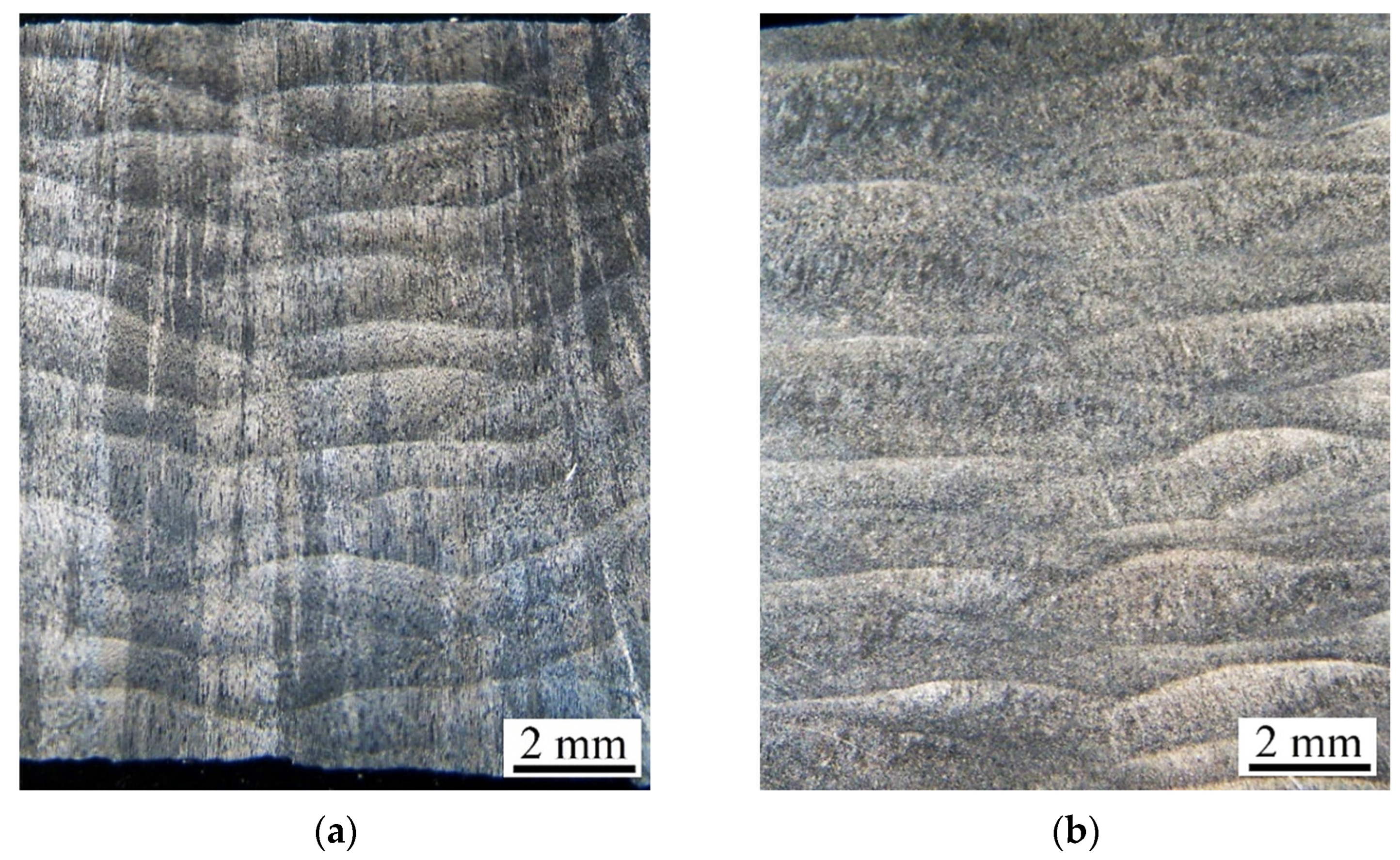 - Fedorov, V.; Rygin, A.; Klimenov, V.; Martyushev, N.; Klopotov, A.; Strelkova, I.; Matrenin, S.; Batranin, A.; Deryusheva, V. Structural and Mechanical Properties of Stainless Steel Formed under Conditions of Layer-by-Layer Fusion of a Wire by an Electron Beam. Met. Work. Mater. Sci. 2021, 23, 111–124. [Google Scholar] [CrossRef]