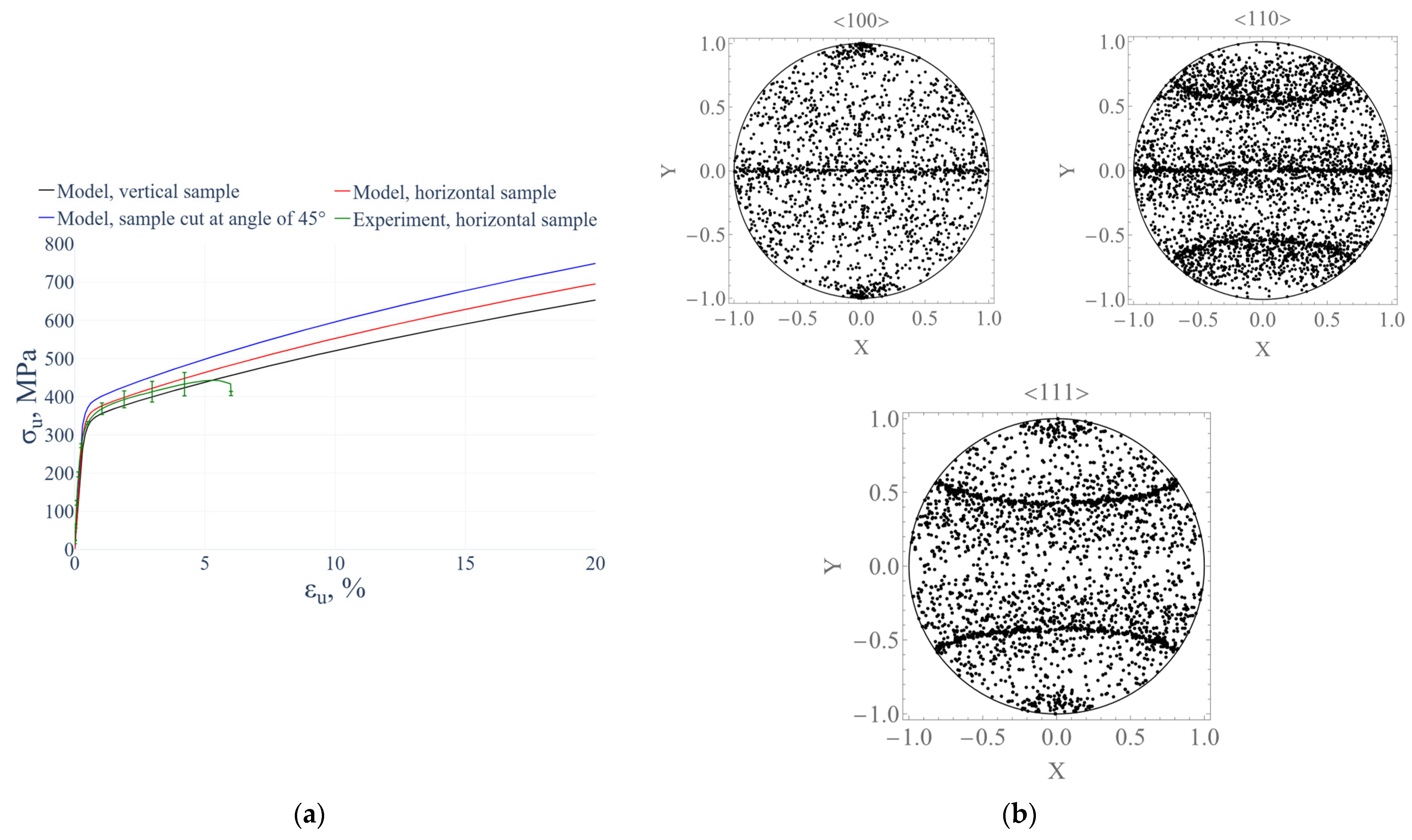 - The statistical model provided good agreement between the calculated and experimental uniaxial tensile curves, with an overall mean deviation during the verification stage not exceeding 3%. The model also captured the anisotropy of the yield strength: the maximum calculated value was obtained for specimens cut at 45° (360 MPa), while the minimum value was for vertical specimens (331 MPa).