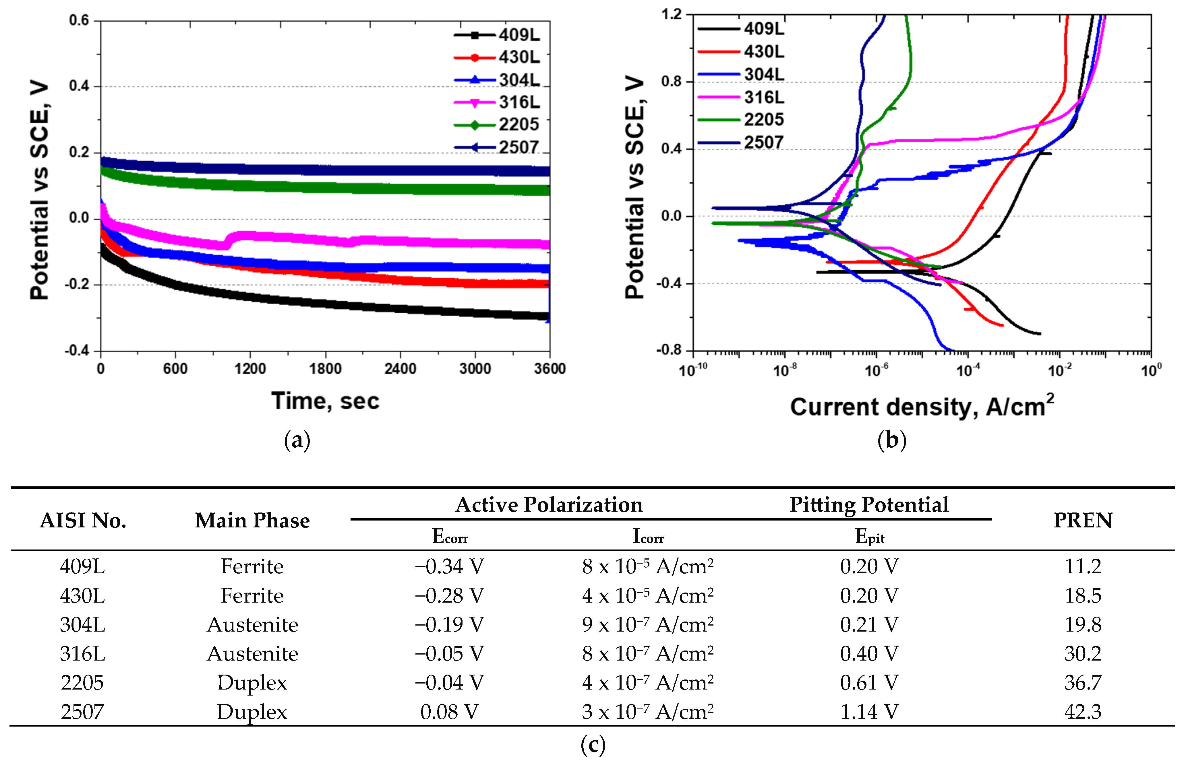3.2. Electrochemical Behavior of Different Stainless Steel Types