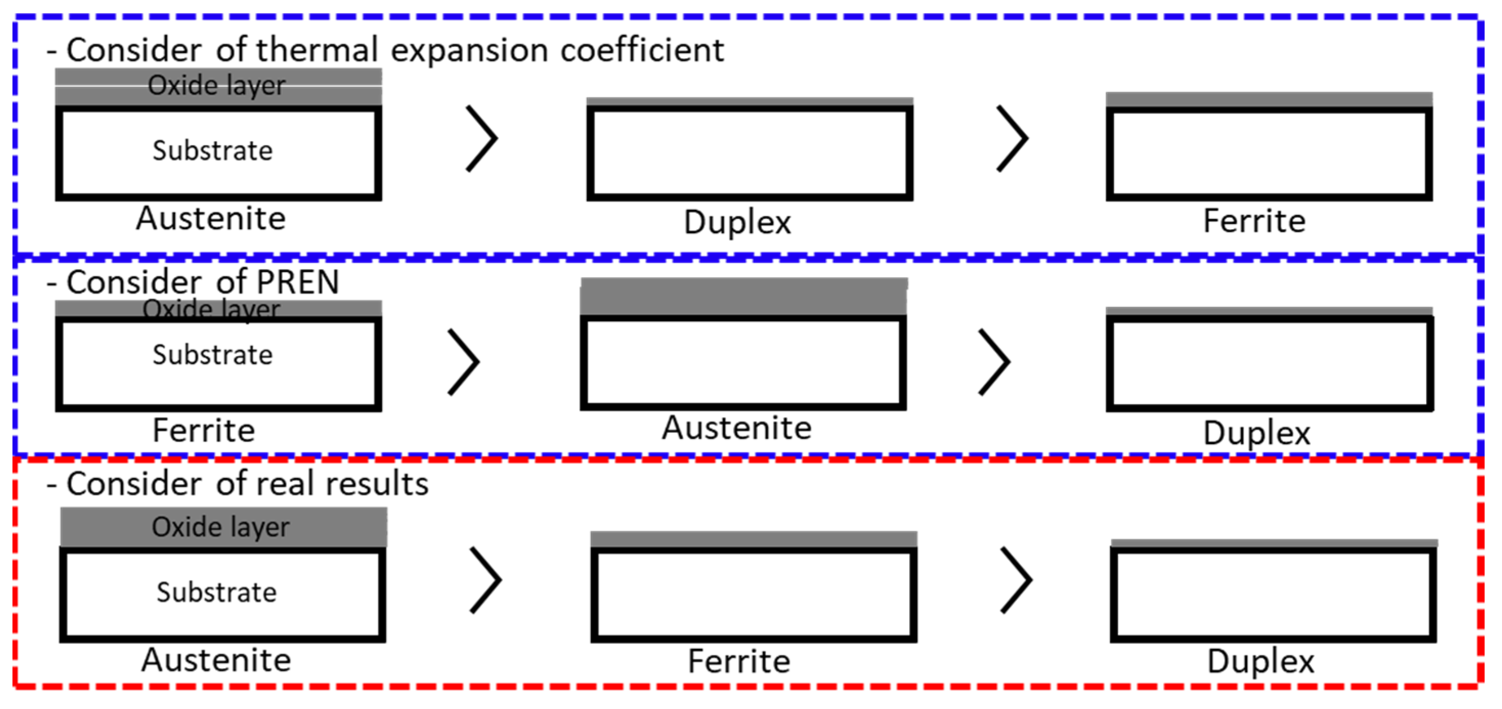 - Phase-dependent thermomechanical properties (particularly thermal expansion and high-temperature strength) significantly influenced oxidation behavior, while alloy composition further modulated passive-film stability. Variations in Cr, Mo, and N altered the electrochemical responses observed in EIS, OCP, and polarization measurements. Differences in thermal expansion also affected oxide-scale cracking and growth kinetics. These findings demonstrate that both metallurgical phase and alloy composition jointly determine high-temperature corrosion resistance, and neither parameter alone sufficiently explains the observed degradation trends.