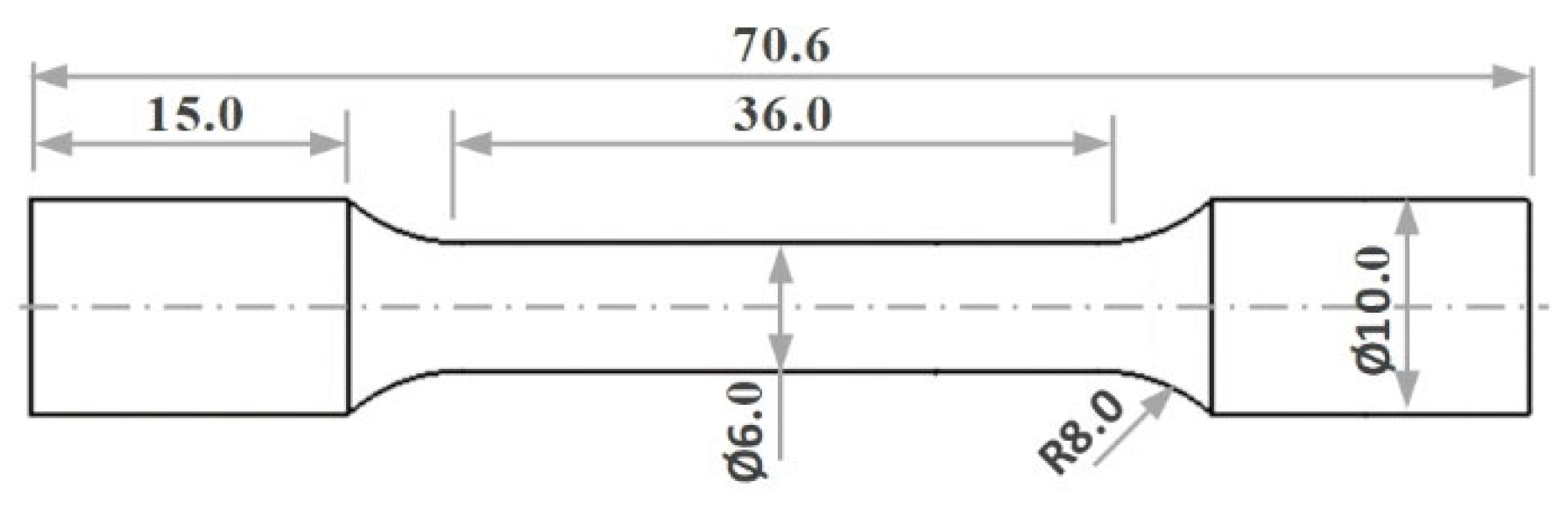 Figure 2 was precisely fabricated on a CNC lathe (DMG Mori, Wernau, Germany) to ensure the required dimensional accuracy and surface finish for reliable mechanical testing. The room-temperature tensile tests were performed using a BESMAK servo-hydraulic tensile testing system (BMT-20D, Besmak, Ankara, Türkiye) at a strain rate of 1 × 10