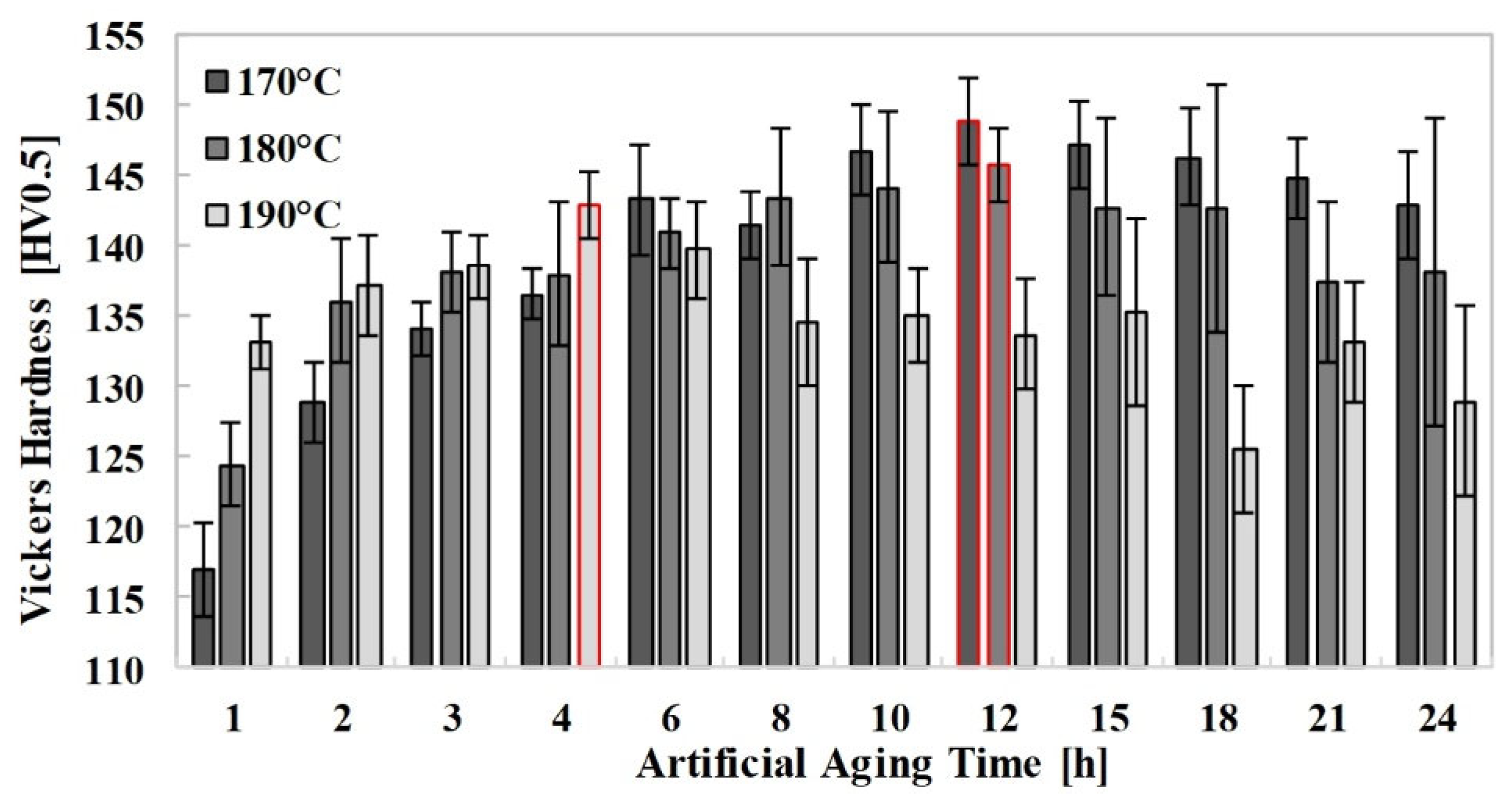 Table 3 to identify the optimum aging temperature and duration that yield maximum hardness. Artificial aging was carried out at temperatures of 170 °C, 180 °C, and 190 °C [