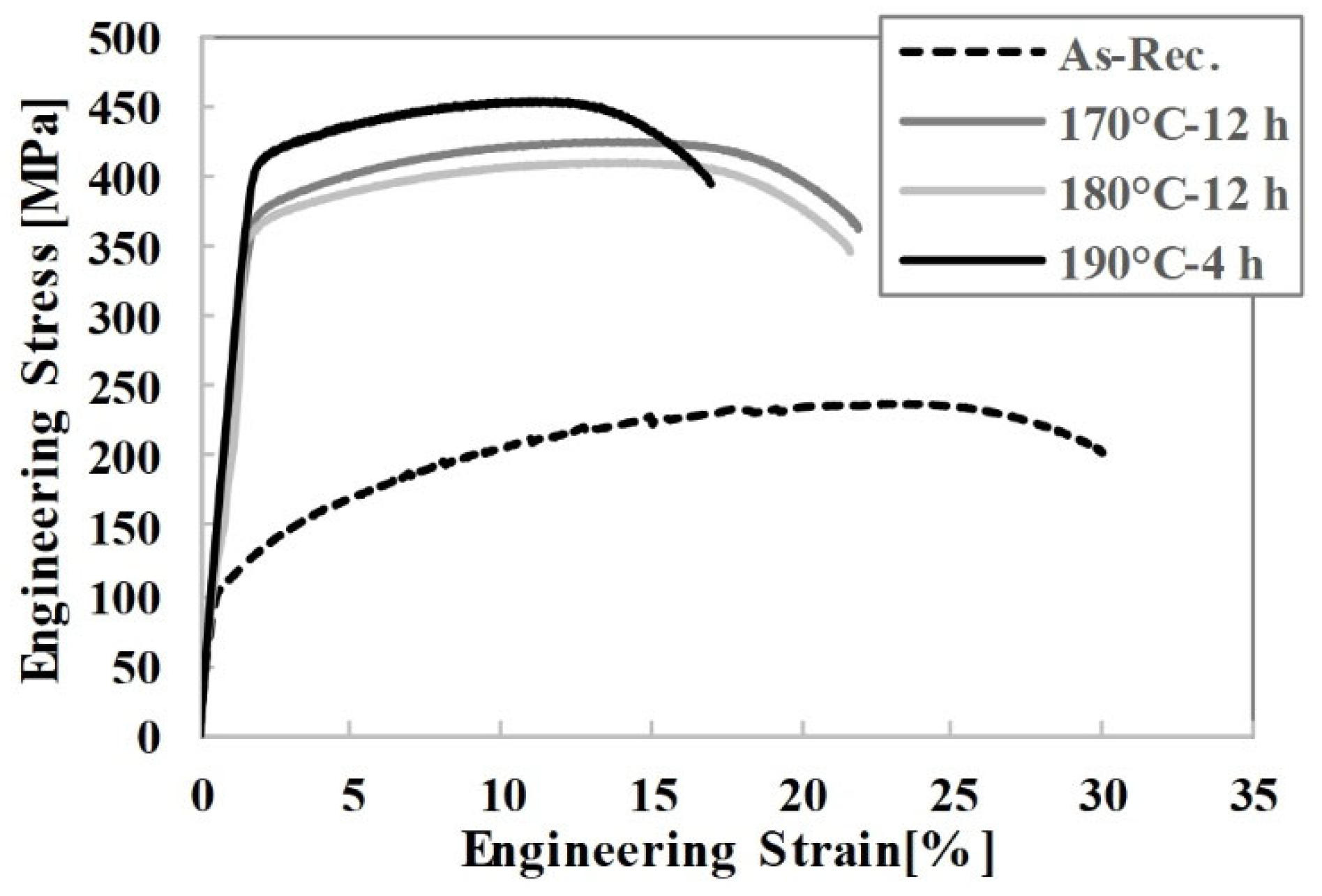 The optimum aging duration that produced maximum hardness at each aging temperature was identified based on the hardness test results. The samples aged for the times corresponding to peak hardness at 170 °C, 180 °C, and 190 °C were subsequently subjected to tensile testing in accordance with ISO 6892-1 standard [