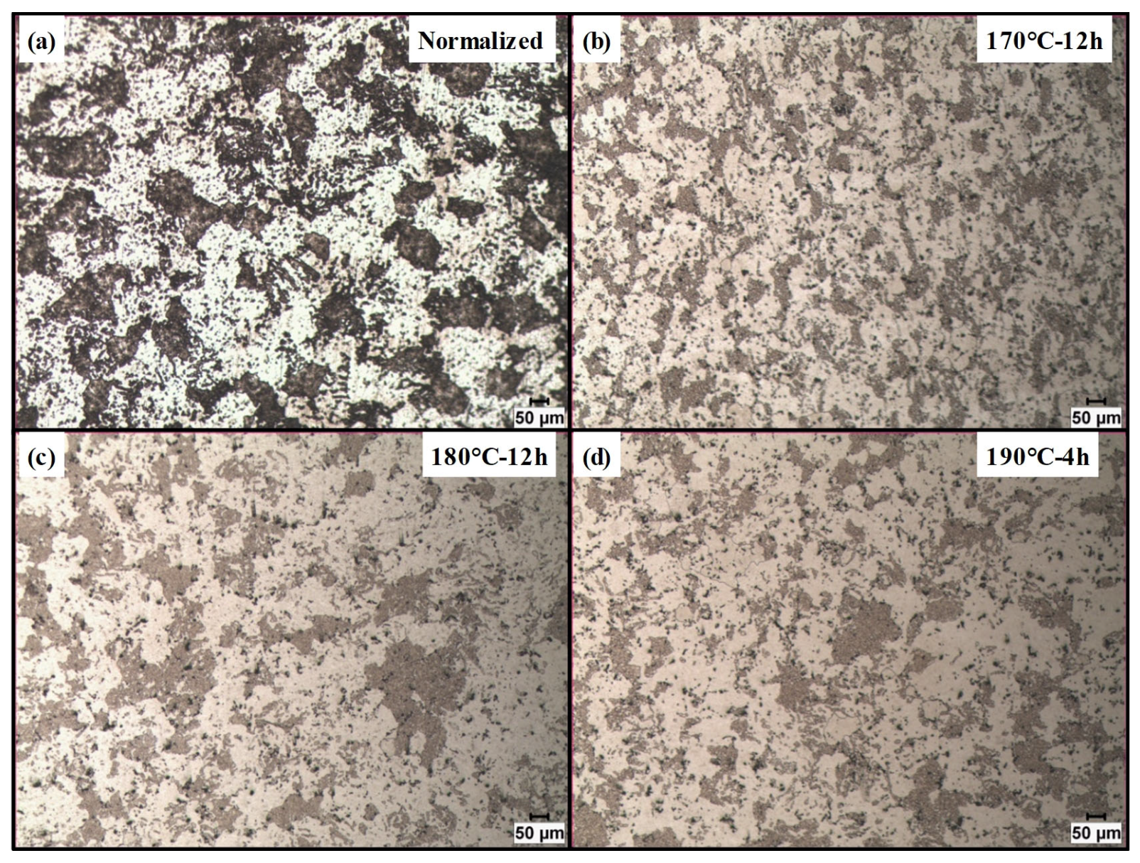 Figure 5. The images correspond to the as-received sample and the specimens exhibiting the highest strength at each investigated aging temperature. The analysis of the grain structures revealed negligible variation in grain size among the different artificial aging conditions. Quantitative grain size measurements were found to be 17.44 ± 3.8 µm, 18.53 ± 3.7 µm, 23.38 ± 5.5 µm for the 170 °C-12 h, 180 °C-12 h and 190 °C-4 h, respectively. Hence, the discrepancy between the hardness and tensile test results cannot be attributed to differences in grain size after artificial aging.