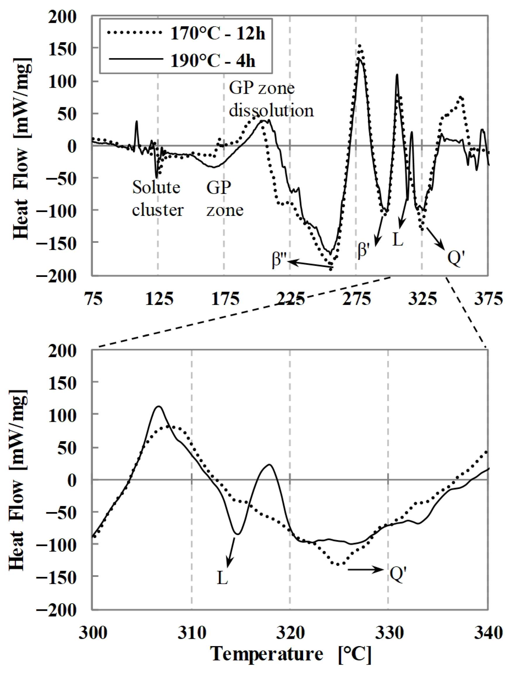 10]. In the specimen aged at 190 °C for 4 h, a fifth exothermic peak appears around 315 °C, which is absent in samples aged at 170 °C for 12 h and corresponds to the formation of L precipitates. Finally, the exothermic peak detected at 325 °C indicates the development of Qʹ precipitates [