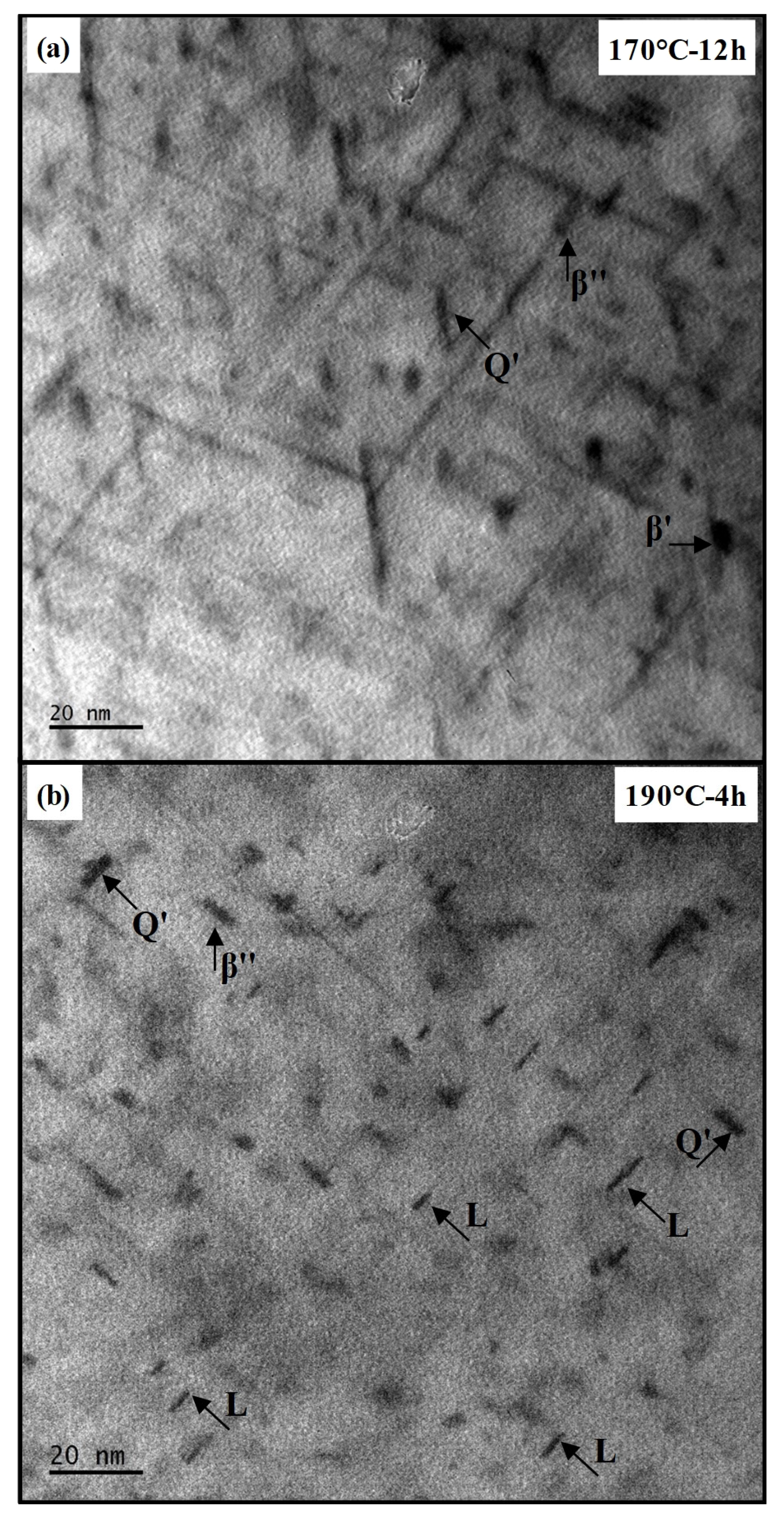 Figure 7b), β″, Q′, and L precipitates (the precursors of the Q′ phase) are detected. Multiple L precipitates with lath-like morphologies and irregular terminations are dispersed within the aluminum matrix. The Q′ precipitates exhibit sharper boundaries and greater thickness compared with the L phase. The average length of the L and Q′ precipitates in the peak-aged condition are measured as 6.95 nm and 7.32 nm, respectively.