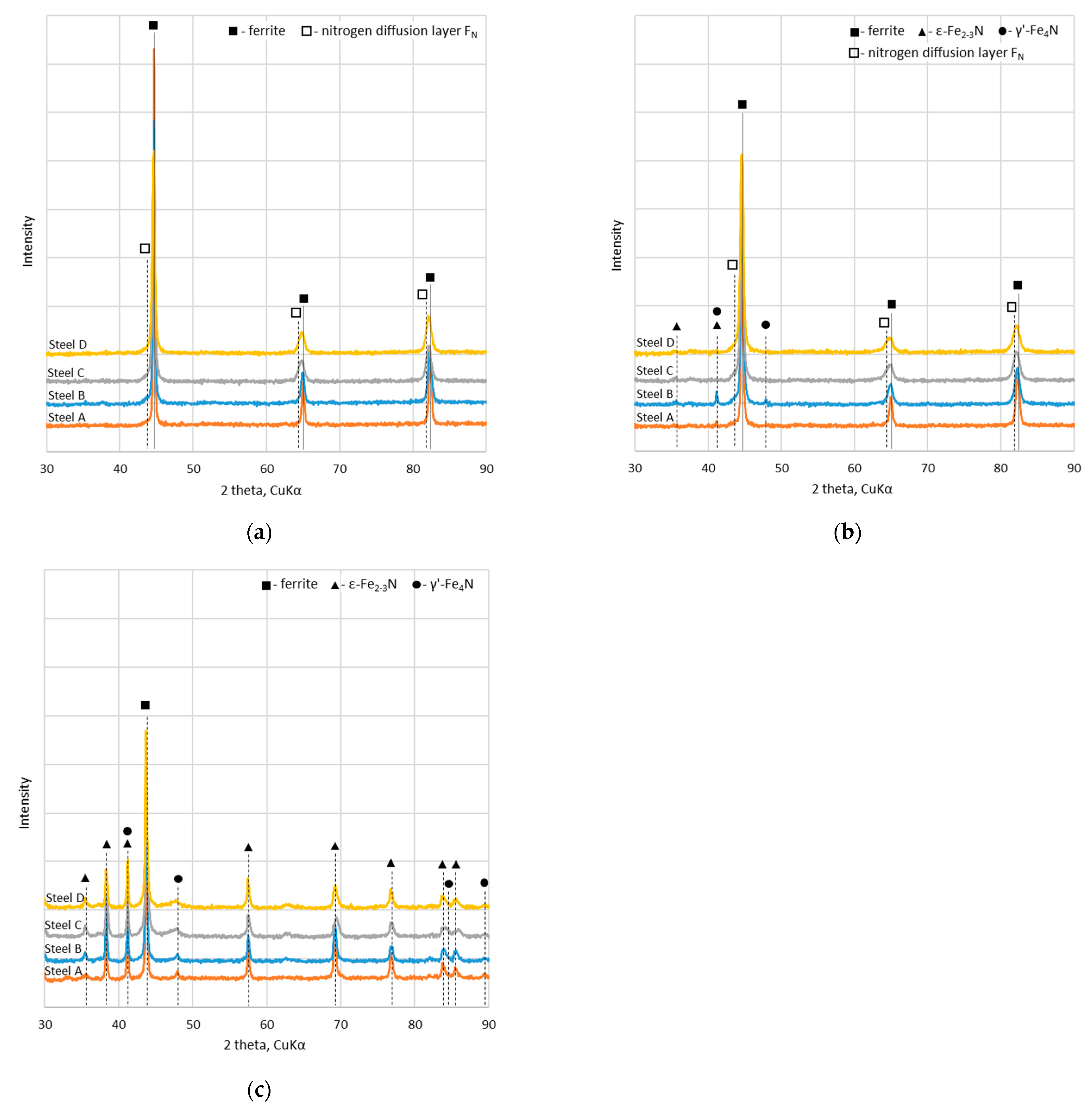 X-ray diffraction analysis (Figure 1) did not reveal distinct reflections characteristic of chromium nitrides; however, their presence within the diffusion zone cannot be excluded. The nanometric size of the precipitated nitrides may account for the absence of detectable peaks, as it limits their identification. In addition, their volume fraction is likely negligible compared with that of the iron nitrides, which would further reduce their detectability [86]. Another contributing factor may be the hexagonal structure of Cr2N, the same as that of Fe3N nitrides observed in the investigated steels after nitriding. Consequently, it is also possible that reflections from chromium nitrides overlap with the diffraction peaks of iron nitrides. It is also possible, as observed by Yakhnina [84], that the detected reflections correspond to complex nitrides of the (Fe,Cr)2N type rather than to simple phases such as Fe3N or Cr2N.
