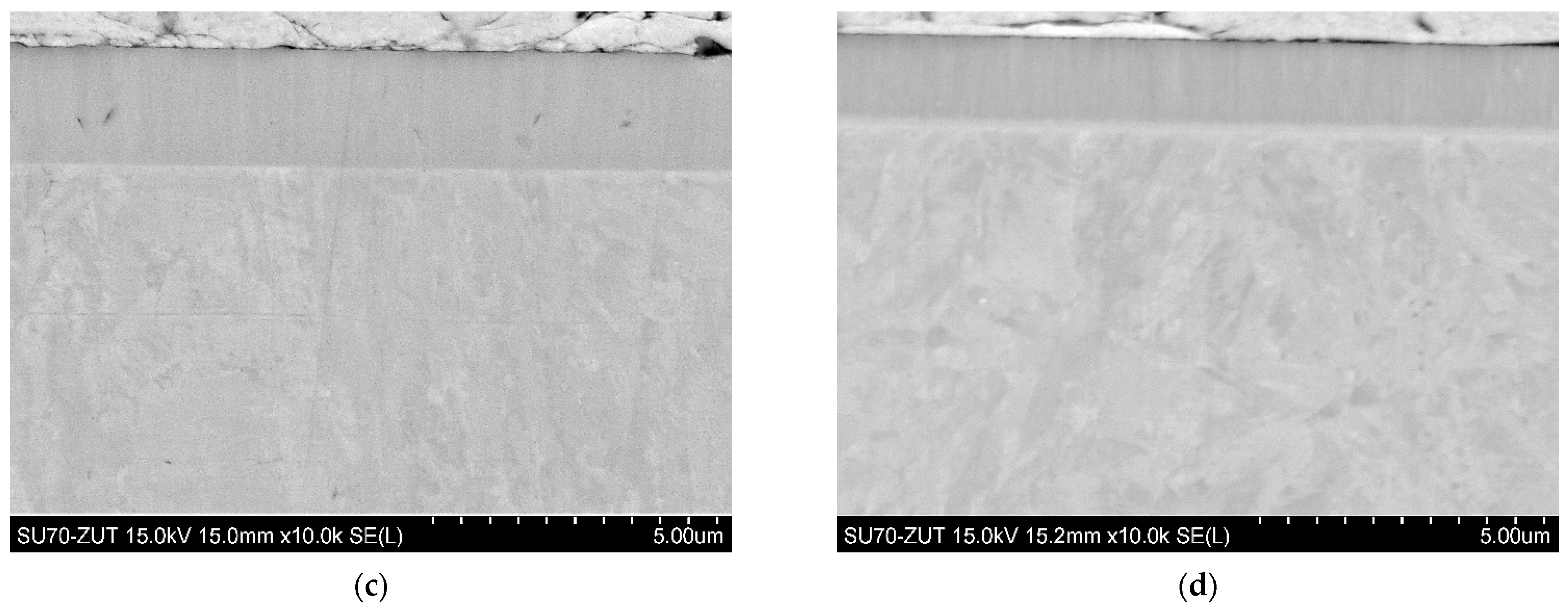 Light optical microscopy (LOM) examinations were performed using a Nikon Ephiphot 200 (Nikon Corporation., Tokyo, Japan). Cross-sections of coatings were examined using an FE-SEM SU-70 (Field Emission Scanning Electron Microscopy) microscope (Hitachi, Naka, Japan).