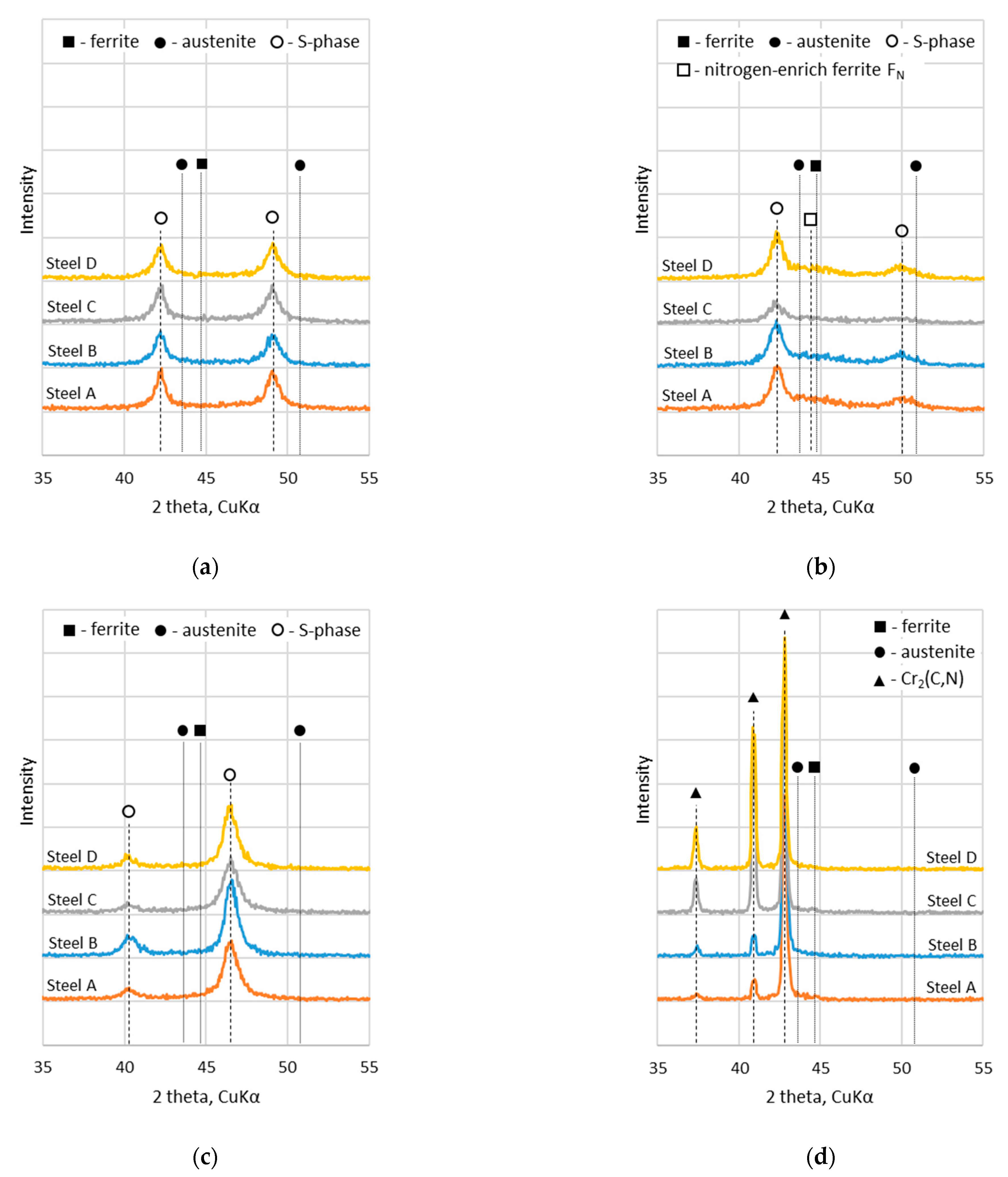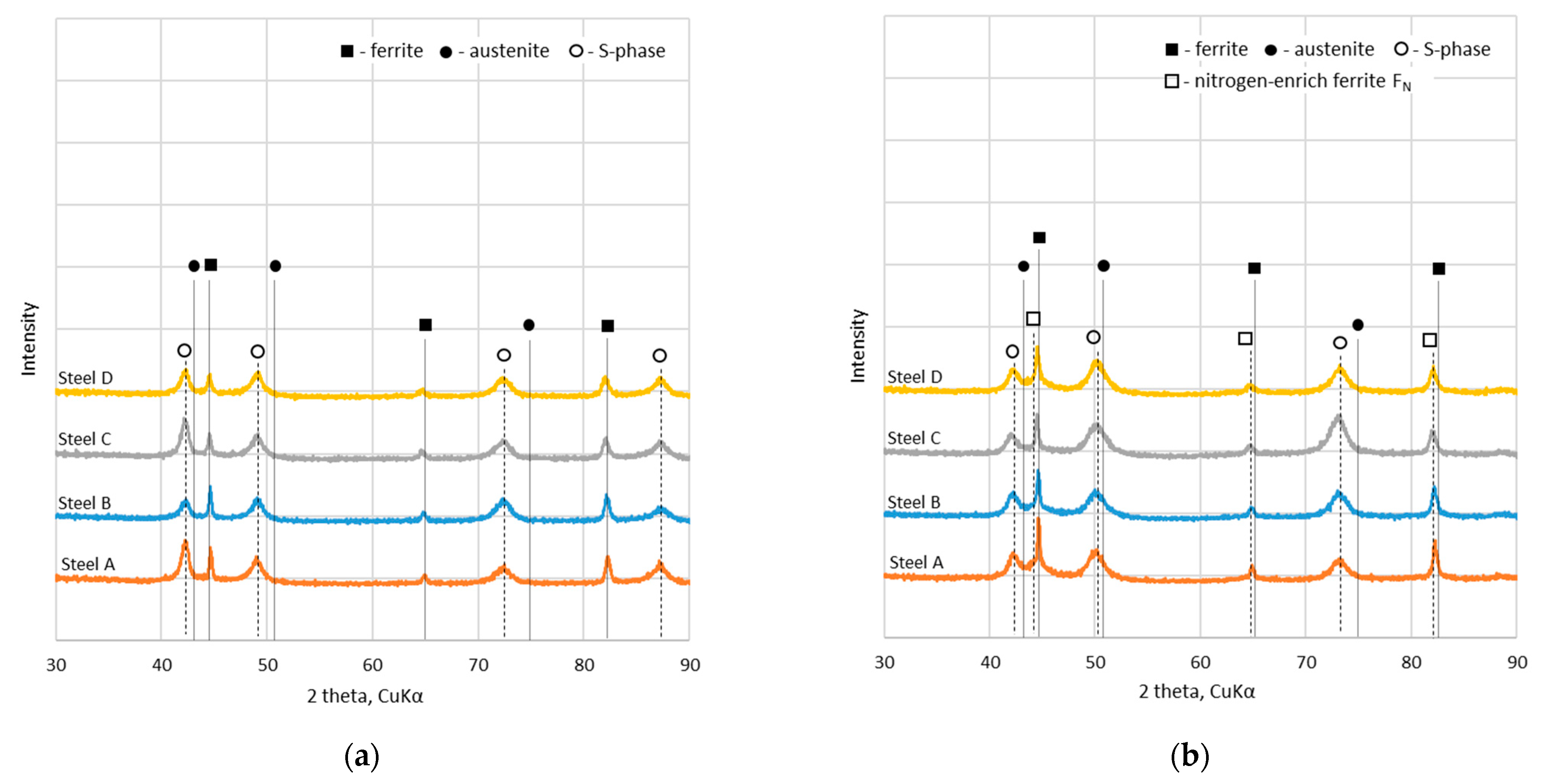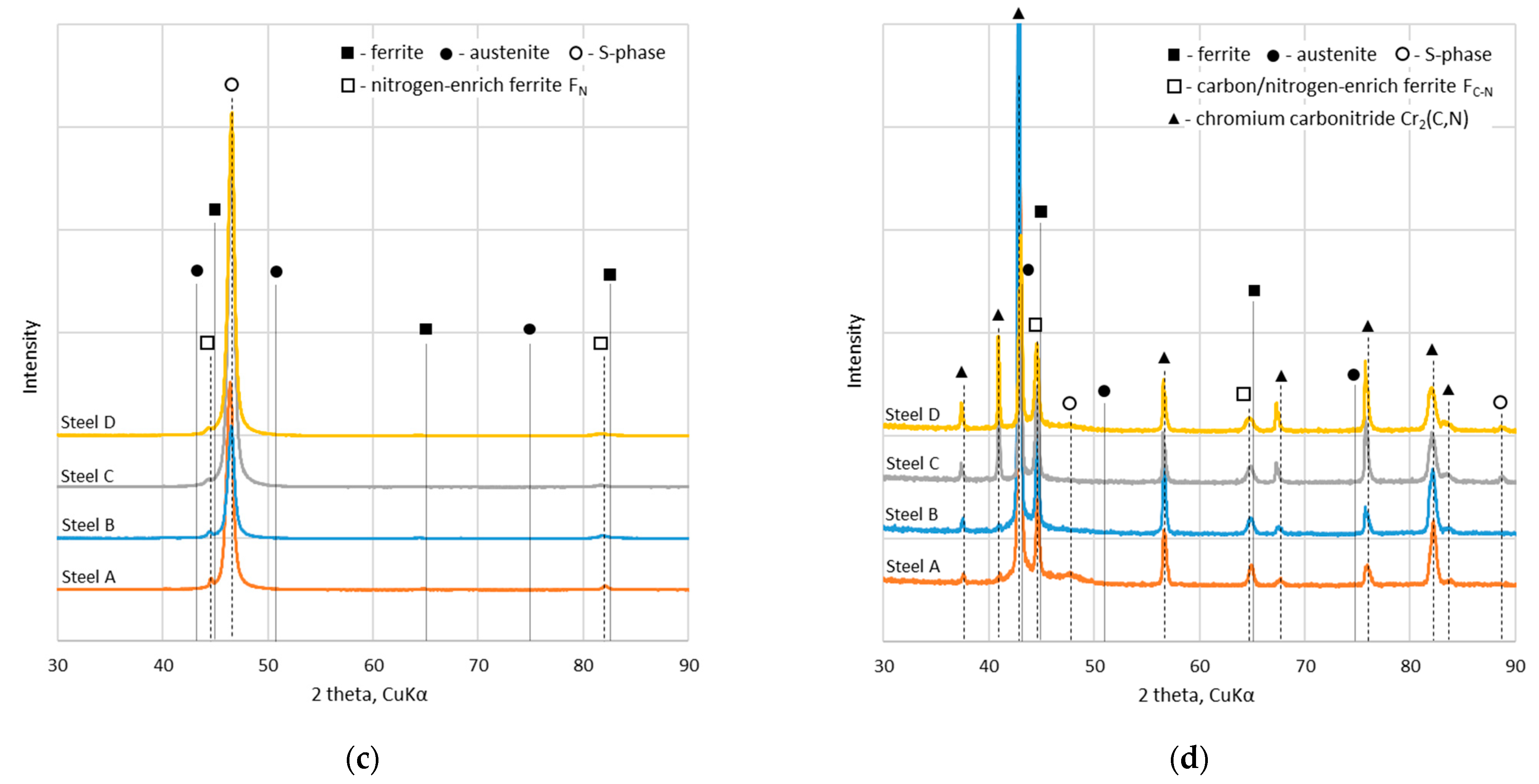 Gas and plasma nitriding are the most widely used thermo-chemical processes. Both treatments promote the development of a nitrogen-enriched diffusion zone and a surface compound layer of iron nitrides, leading to increased hardness and improved resistance to tribological wear, as well as reduced susceptibility to thermally induced cracking [14,15,16,17,18,19,20,21,22,23,24,25,26]. Low-temperature nitriding and carburizing processes have also been extensively studied due to their ability to form the S-phase (expanded austenite), characterized by high hardness and excellent resistance to abrasive wear; however, its formation typically requires an austenitic substrate [27,28,29,30,31,32,33,34,35].
