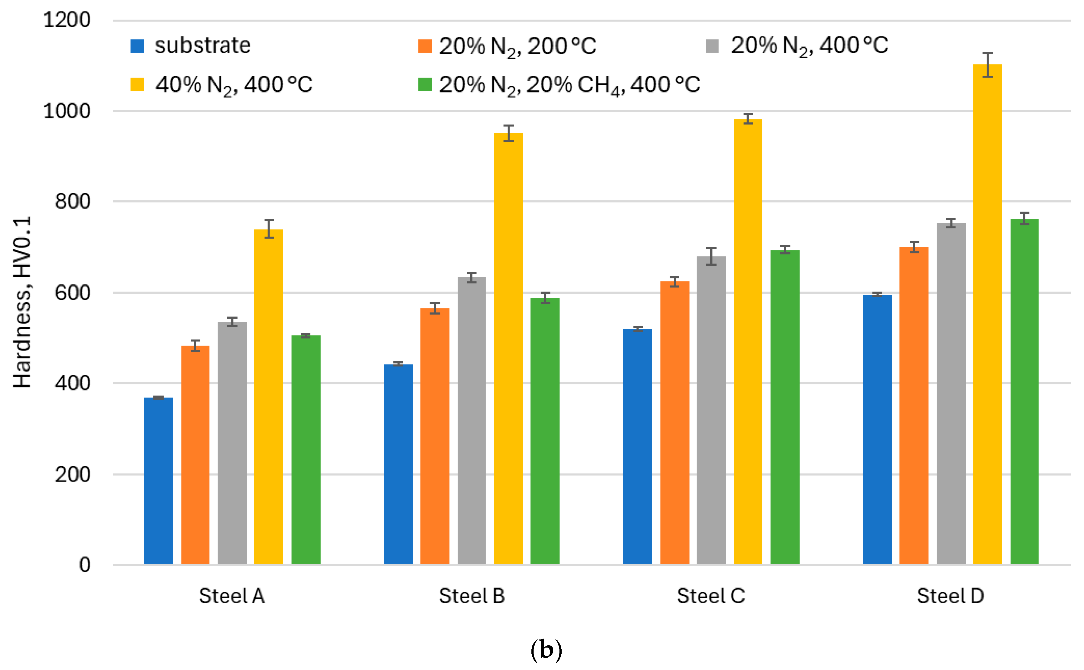 Figure 6. Hardness of the samples: (a) nitrided steels; (b) steels with S-phase coating.