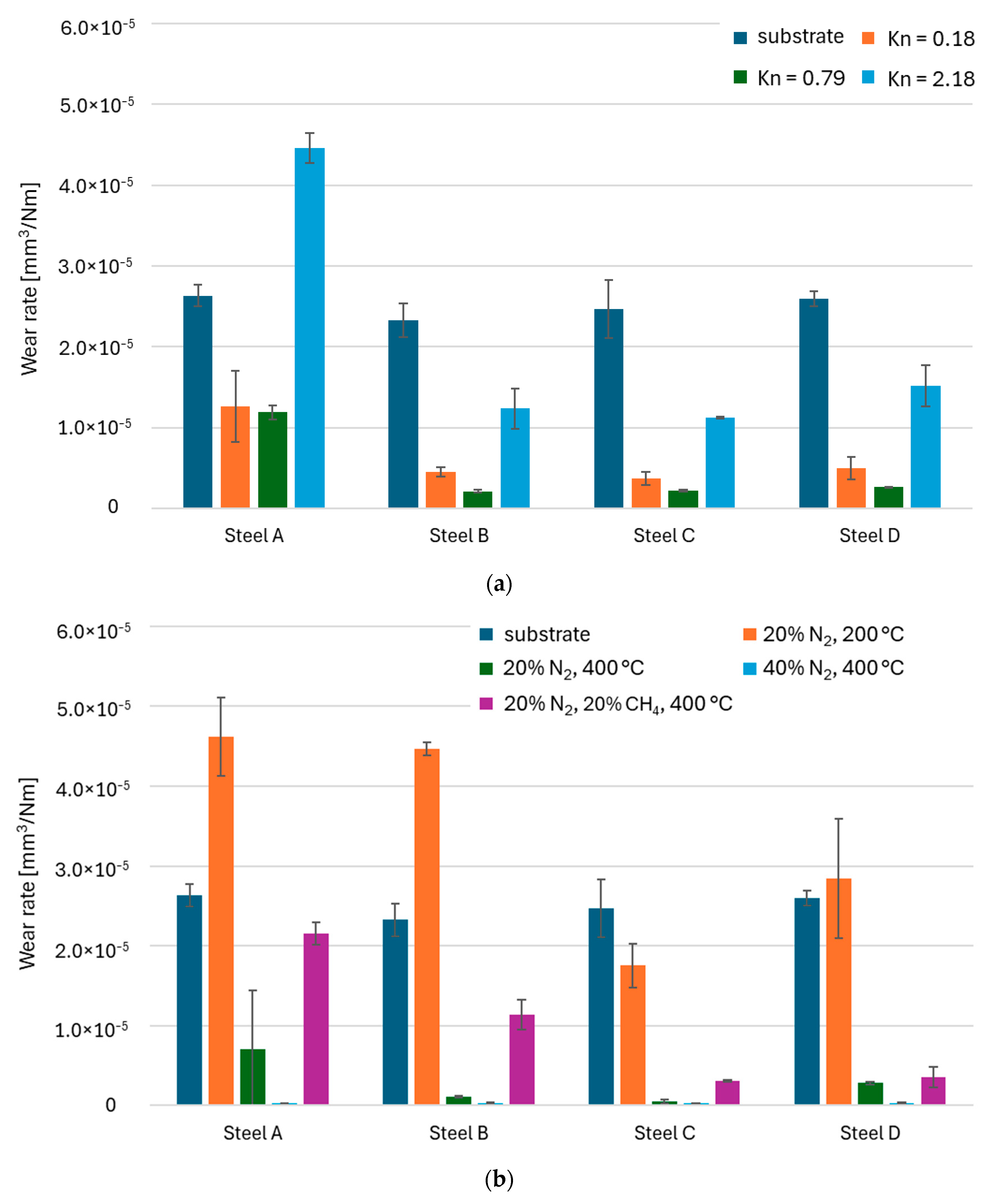 Figure 7. Samples wear rate for: (a) nitrided steels; (b) steels with S-phase coating.