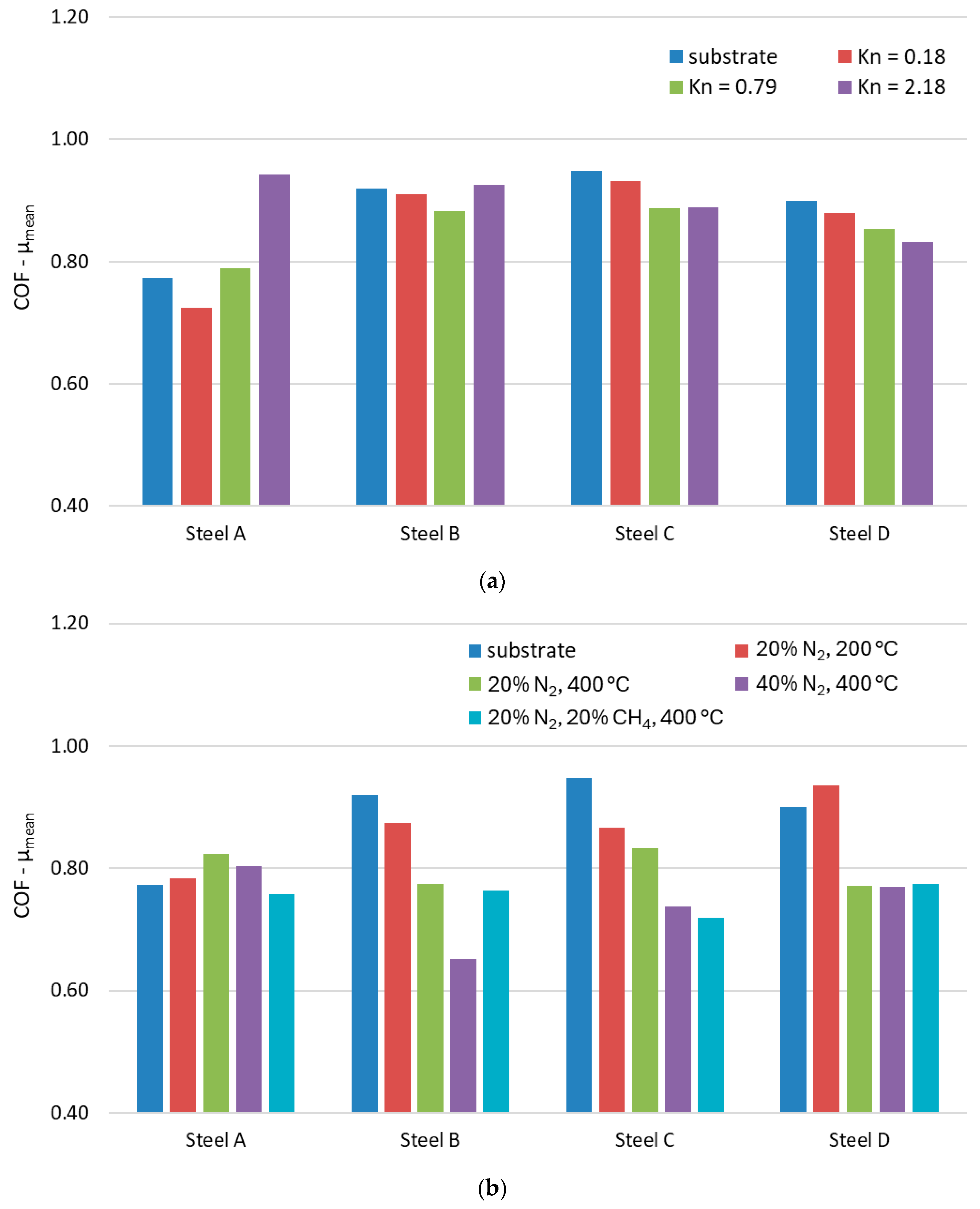 All S-phase coatings deposited on steel A exhibited a coefficient of friction comparable to that of the untreated substrate (Figure 9b). For the remaining steels, however, the coatings showed lower COF than the respective substrates, except for the coating deposited on steel D at 200 °C in an atmosphere containing 20 vol.% N2. In this particular case, however, it is possible that the coating, due to its brittleness and poor adhesion, delaminated at the initial stage of the test, which resulted in a higher measured µmean value.