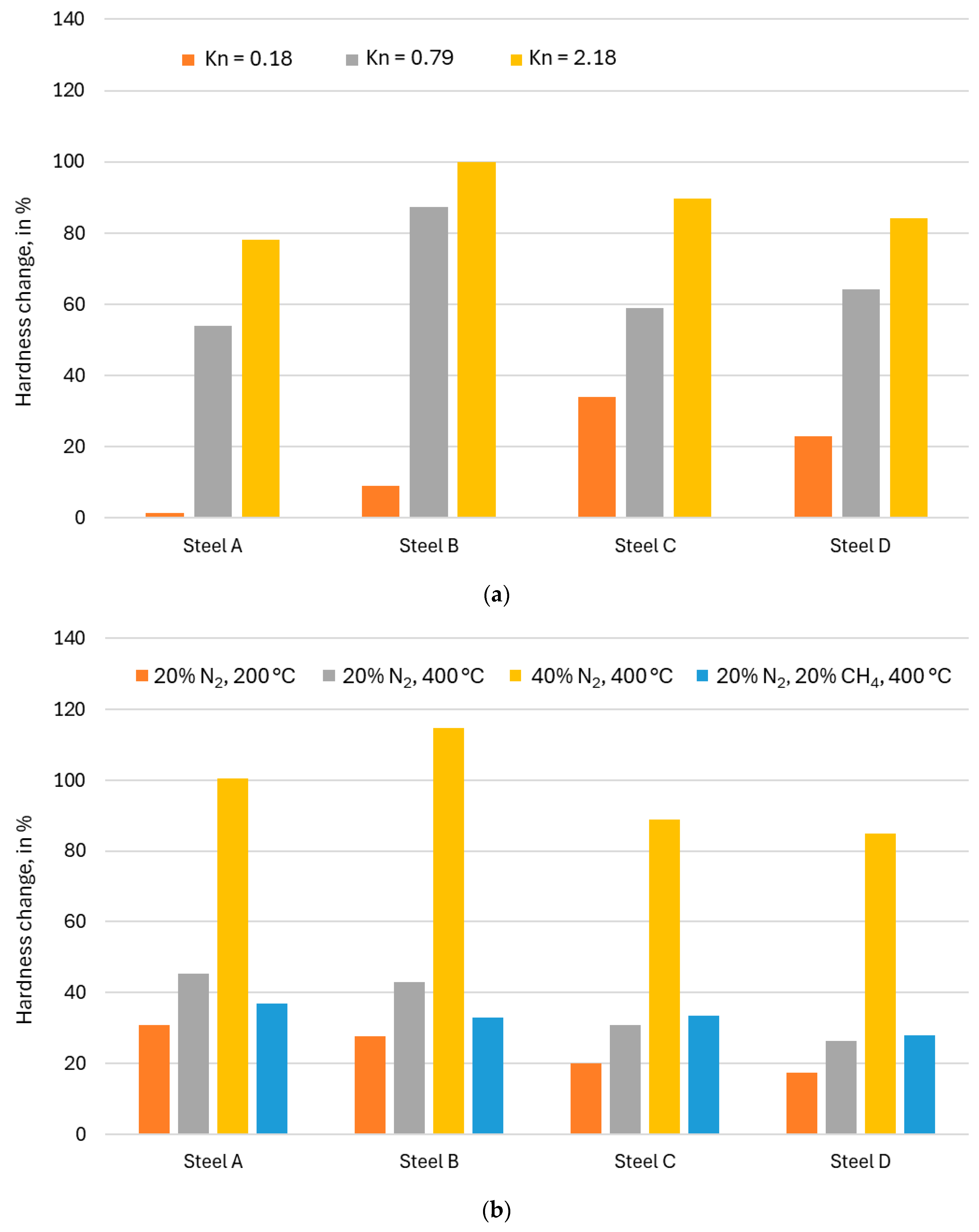Although the observed variations in hardness of the nitrided samples primarily reflect differences in the intrinsic hardness of the quenched steels and the applied nitriding potential Kn, the analysis of the relative hardness increase indicates a significant effect of the chemical composition on the hardness of the nitrided samples, compared to the hardness of the quenched steels. As shown in Figure 10, the highest hardness increment was observed for steel B, whereas the lowest was observed for steel A, except for specimens nitrided at the lowest nitriding potential. Examination of Figure 10a in combination with the chemical composition of the investigated steels (Table 1) demonstrates that these differences are mainly governed by the carbon content. Steel B (60CrMoV18-5) contains the highest carbon level among the investigated tool steels (0.6 wt.% C). Steel C (X50CrMoV5-2) exhibits a slightly lower carbon content of 0.5 wt.% C, while steels A (40CrMnNiMo8-6-4) and D (X38CrMoV5-3) possess the lowest carbon contents of about 0.4 wt.% C.