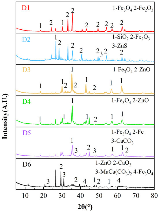 X-ray diffraction (XRD) was performed to identify the major mineral phases of the representative zinc-bearing dusts. The XRD patterns of the six zinc-bearing dust samples (D1–D6) are presented in Figure 1. The XRD patterns indicate that iron mainly exists as Fe3O4 and Fe2O3, while Zn is primarily present as ZnO (D3, D4 and D6) and ZnS (D2). Pb-bearing crystalline phases were not clearly detected by XRD, likely due to the relatively low Pb content and/or peak overlap; thus Pb is reported as total Pb by XRF.