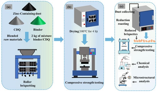 The experimental procedure is schematically illustrated in Figure 2. The raw material formulation was first determined based on the relative generation rate of zinc-bearing dusts from different section in the steel mill, and a mixture was prepared with the following composition: D1 (17.58%), D2 (10.99%), D3 (10.99%), D4 (18.32%), D5 (36.63%), and D6 (5.49%). The chemical composition of the mixture is shown in Table 7. The content of Na2O and Zn is high, and they need to be removed as much as possible during direct reduction. Then, predetermined amounts of binder and CDQ were added to the mixture of dusts. For each batch, 2 kg of the blended material was accurately weighed and thoroughly homogenized before being fed into a double-roll briquetting machine (YQ250 × 50, Hengchang Metallurgical Building Materials Equipment Co., Ltd., Gongyi, China) for agglomeration. Under optimized briquetting parameters (briquetting pressure 20 MPa, binder dosage 4%, moisture content 14%), the resulting green briquettes were dried in a forced-air oven at a constant temperature of 100 °C for 4 h. Finally, the compressive strength of the dried briquettes was measured using a universal testing machine (WDW-50, Fangchen Instrument & Equipment Co., Ltd., Jinan, China), and those meeting the specified standards were selected for subsequent reduction experiments.