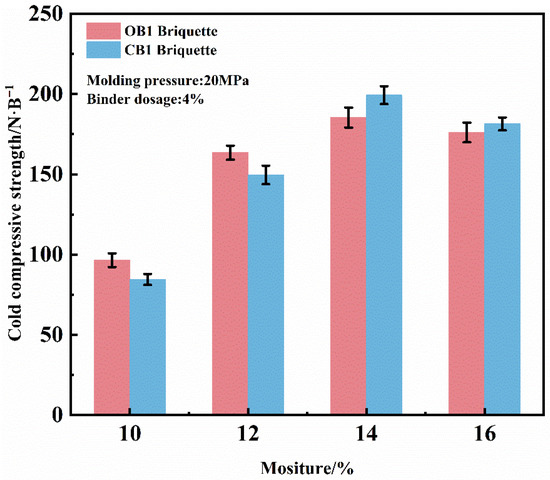 The influence of moisture on the briquette performance was evaluated under fixed parameters of 4% binder and 20 MPa molding pressure, as illustrated in Figure 5. The results reveal that the compressive strength initially increases gradually with moisture content up to a critical point. Beyond 14% moisture content, however, the strength of both briquette types exhibits a clear declining trend. Accordingly, an optimal molding moisture content of 14% is suggested. Under this condition, the compressive strengths of dry OB1 and CB1 briquettes reached 184 N/briquette and 199 N/briquette, respectively, demonstrating the superior strengthening capability of the novel composite binder.