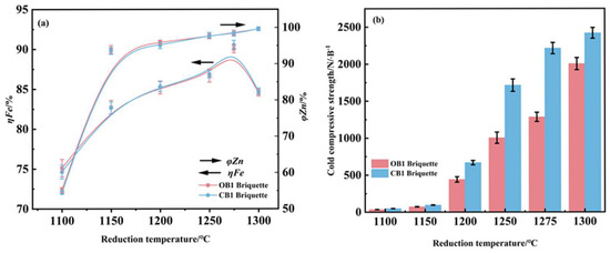 Influence of reduction temperature on the metallization degree and zinc removal rate (a) and compressive strength (b) of reduced briquettes. (reduction time 25 min; carbon content 4%).