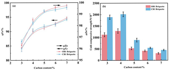 Influence of carbon content on the metallization degree and zinc removal rate (a) and compressive strength (b) of reduced briquettes (reduction temperature 1275 °C; reduction time 25 min).