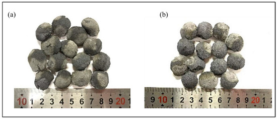 Macroscopic images of the directly reduced OB1 and CB1 briquettes are shown in Figure 9. The CB1 briquettes exhibit a higher porosity and a notable metallic luster due to the complete volatilization of zinc from the surface. Consequently, both the metallization degree and the zinc removal rate are significantly enhanced, resulting in a higher compressive strength. In contrast, the OB1 briquettes have a dull surface color, evident cracks, and a looser structure, which leads to their lower compressive strength.