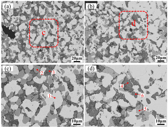 As shown in Figure 11 the briquettes prepared with the composite binder (CB1) exhibited a highly compact internal structure and substantially improved mechanical strength after reduction at 1275 °C for 25 min with 4 wt% carbon addition. As shown in Table 9, EDS analysis revealed that the dominant gangue phases, including Mg-rich ferrite (Area 2), calcium aluminosilicate (Areas 3 and 6), and calcium silicate (Areas 4 and 5), had completely transformed into high-melting stable compounds such as MgFe2O4, Ca2Al2SiO7, and (Ca, Fe)2[SiO4]. The suppression of low-melting sodium aluminosilicate formation effectively prevented the structural degradation observed in OB1 briquettes.