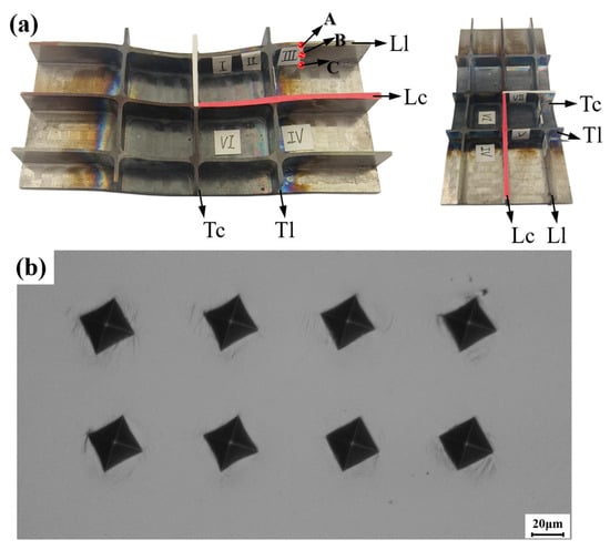 Sampling positions of I~VII characteristic specimens (a) and typical Vickers indentation (b) of Ti2AlNb-based alloy stiffened panel for microstructure observation. A, B, C denote the top, mid and bottom positions of the rib.