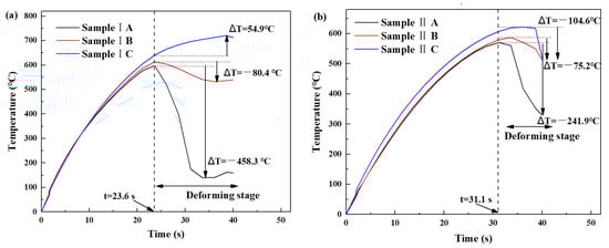 Region III begins to participate in plastic deformation at 33.6 s, and the temperature at the beginning of deformation is 529.7 °C at A, 520.9 °C at B, and 486.7 °C at C, and the temperature drops less than 72.8 °C during the deformation process.
