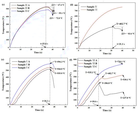 Region V and VII maintained TA < TB < TC throughout the whole process, and the temperature of region V continued to rise before 36.1 s (596.3 °C at A, 544.0 °C at B, and 519.0 °C at C), then dropped rapidly after 36.1 s, and the cooling rate of A was the fastest while C was the lowest. Before 18.6 s, the temperature of VII A continued to rise to 386.8 °C, then dropped rapidly and slowly rose to 237.8 °C; the temperature of VII B quickly rose to 482.7 °C and then slowly rose to 530.1 °C; and the temperature of VII C kept rising until the maximum temperature of 720.1 °C.