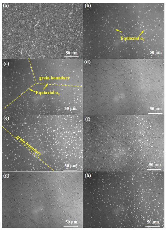 Figure 5 shows the metallographs of region I~VII. In the metallograph, the equiaxial structure with high contrast is the bulk α2 phase, while the structures with low contrast are the B2 phase and the O phase. It is not easy to distinguish the B2 phase and the O phase in the metallographs due to the magnification. As can be seen from Figure 5, equiaxed block α2 phase in region I~VII is distributed uniformly inside the B2 phase matrix and regularly at the grain boundaries. The volume fractions of α2 phase in region I, II, and III are 3.7 ± 0.5%, 4.0 ± 0.4%, and 3.9 ± 0.5%, and the size is 3.21 ± 0.11 μm, 3.37 ± 0.21 μm, and 3.35 ± 0.17 μm, respectively. Compared with the initial structure, the volume fraction of the α2 phase in region I~III decreased significantly, and the size decreased by 3.9~8.5%. The volume fractions of the α2 phase in region IV~VII are 8.61 ± 1.1%, 8.47 ± 0.5%, 8.63 ± 0.4%, and 8.52 ± 0.5%, respectively. The dimensions are 3.57 ± 0.12 μm, 3.49 ± 0.08 μm, 3.62 ± 0.11 μm, and 3.50 ± 0.13 μm, respectively. Compared with the initial structure, the volume fraction and size of the α2 phase in region IV~VII have no significant change.