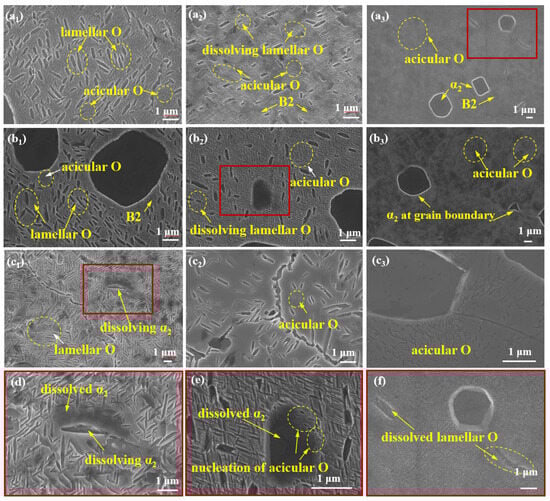 SEM images of region I~III of EAPBed Ti2AlNb-based alloy stiffened panel: (a1) IA; (a2) IB; (a3) IC; (b1) IIA; (b2) IIB; (b3) IIC; (c1) IIIA; (c2) IIIB; (c3) IIIC; (d) enlarged image of red frame in IIIA; (e) enlarged image of red frame in IIB; and (f) enlarged image of red frame in IC.