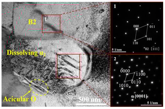 To verify the α2 phase decomposition observed in the SEM images, Figure 7 shows the transmitted bright field of region IIB, with the selected area electron diffraction (SAED) patterns presented for area 1 and area 2, respectively. Area 1 corresponds to the matrix B2 phase, area 2 is the decomposing α2 phase, and the nucleation of the acicular O phase can be observed as well in the lower left corner of the α2 phase.
