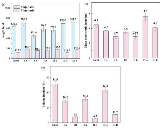 The size, aspect ratio, and volume fraction distribution of lamellar O phase of sample I~III: (a) major axis and minor axis length; (b) mean aspect ratio; and (c) volume fraction.